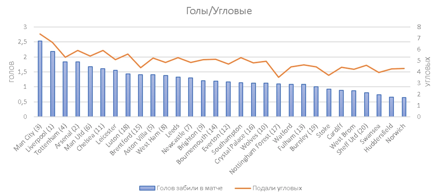 Как видно из графика, чем меньше команда забивает, тем меньше она подает угловых. Есть общий тренд. Есть исключения из правил, например Ноттингем резкое падение по угловым, но голов забили больше чем Фулхэм. Такие исключения есть в любых расчетах, тут важен общий тренд. Ярко по нему отображаются топы АПЛ, Ман Сити и Ливерпуль.