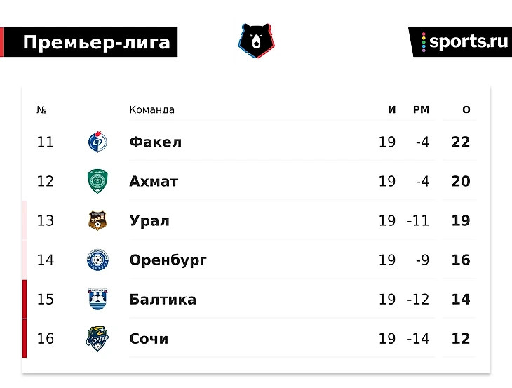 В зоне вылета только одно изменение – «Уфа» упала вниз вместо «Кубани». То есть кардинально за следующие 17 туров ничего не поменялось.