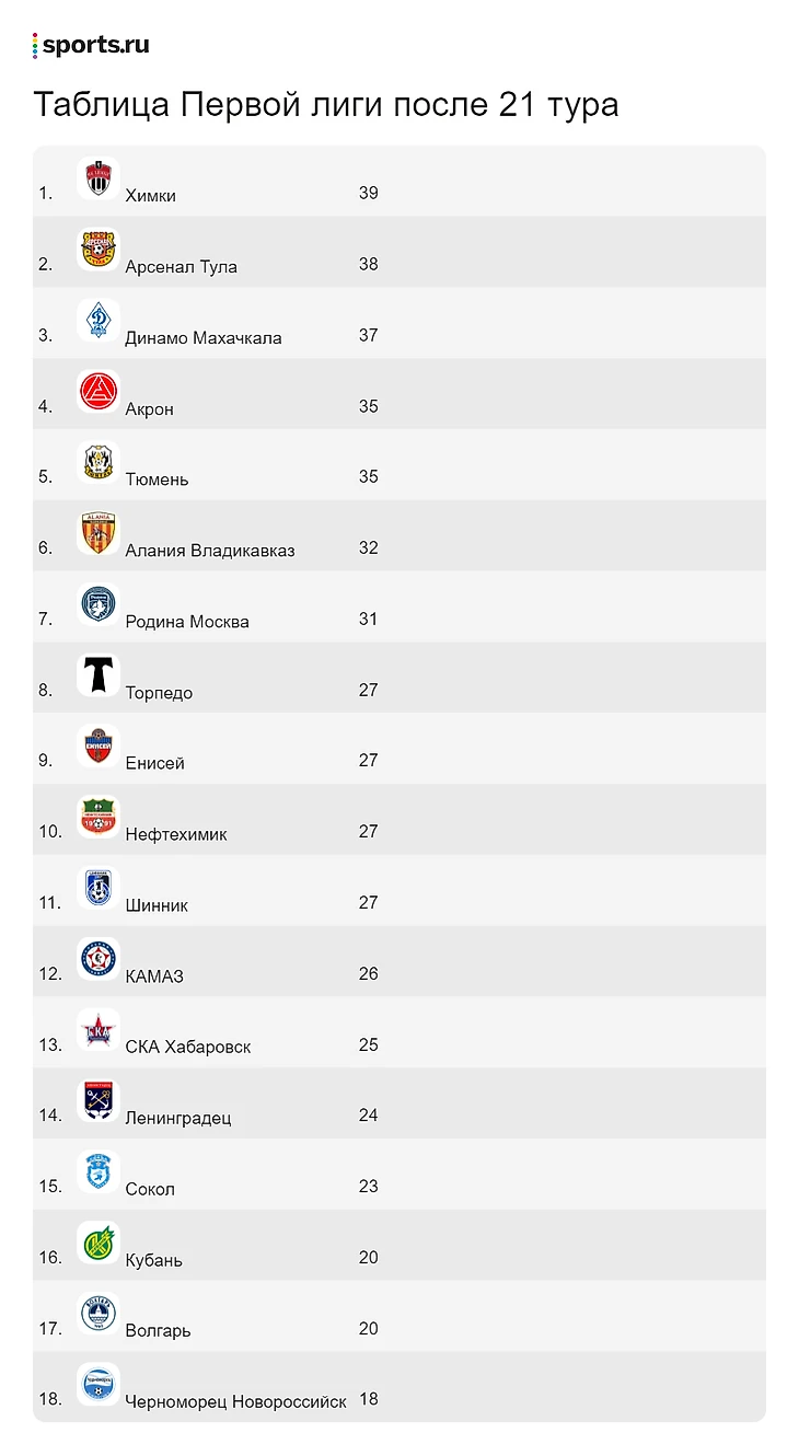 В Первой лиге поменялись фавориты: никакого «Торпедо» и «Енисея», зато Тула уже вторая, а впереди всех – «Химки»