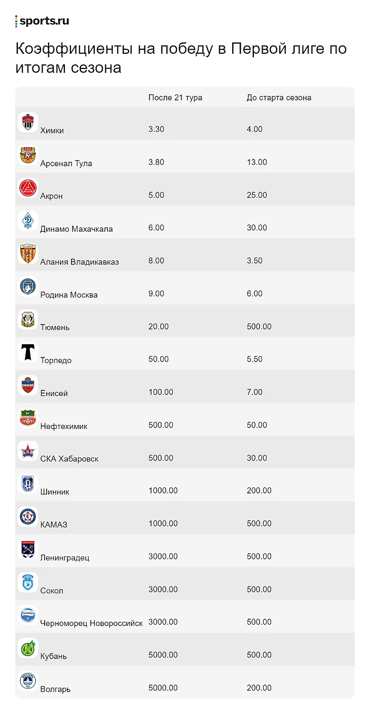 В России на Первую лигу не такая широкая линия для ставок, так что мы не можем оценить, что именно дают букмекеры на прямой выход или вылет, но цифры на победу в лиге также красноречивы. На данный момент, «Химки» – фаворит, а «Арсенал» – второй претендент.
