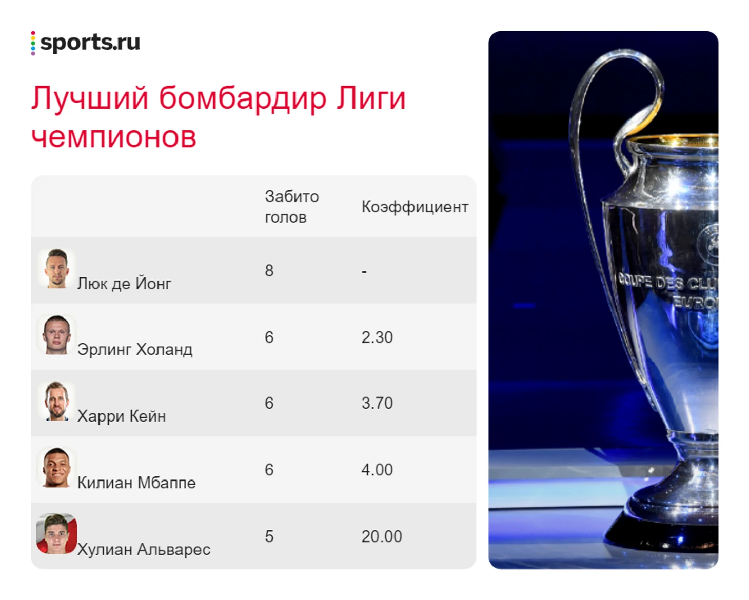 Букмекеры вообще не рассматривают Люка де Йонга фаворитом, хотя у мужчины преимущество в два мяча над главной троицей Европы – Холандом, Кейном и Мбаппе.