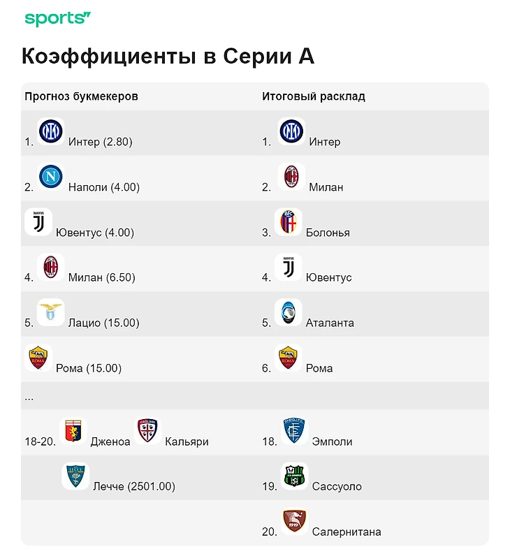 В топ-6 попали две команды не из стартового прогноза. Главная неожиданность – «Болонья», которую котировали примерно 12-й с коэффициентом 501.00 на чемпионство.