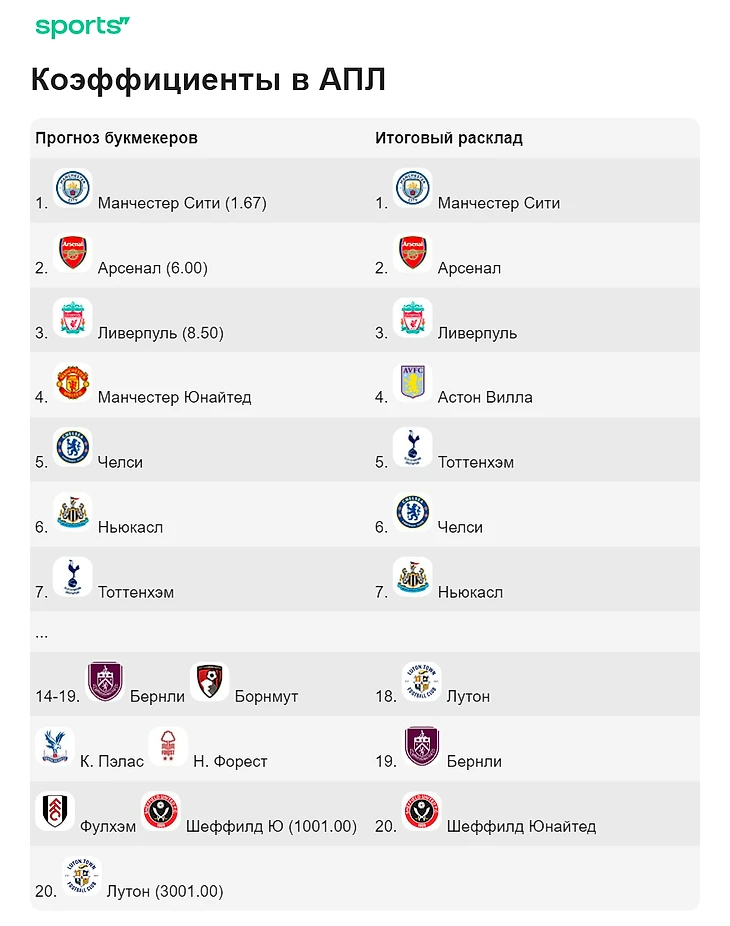 В Англии угадали с первой тройкой, но это, казалось, предсказать было несложно. А «МЮ» и «Челси» букмекеров подвели – четвертое лигочемпионское место заняла «Астон Вилла», которая в прогнозах шла девятой с коэффициентом 151.00 на чемпионство.