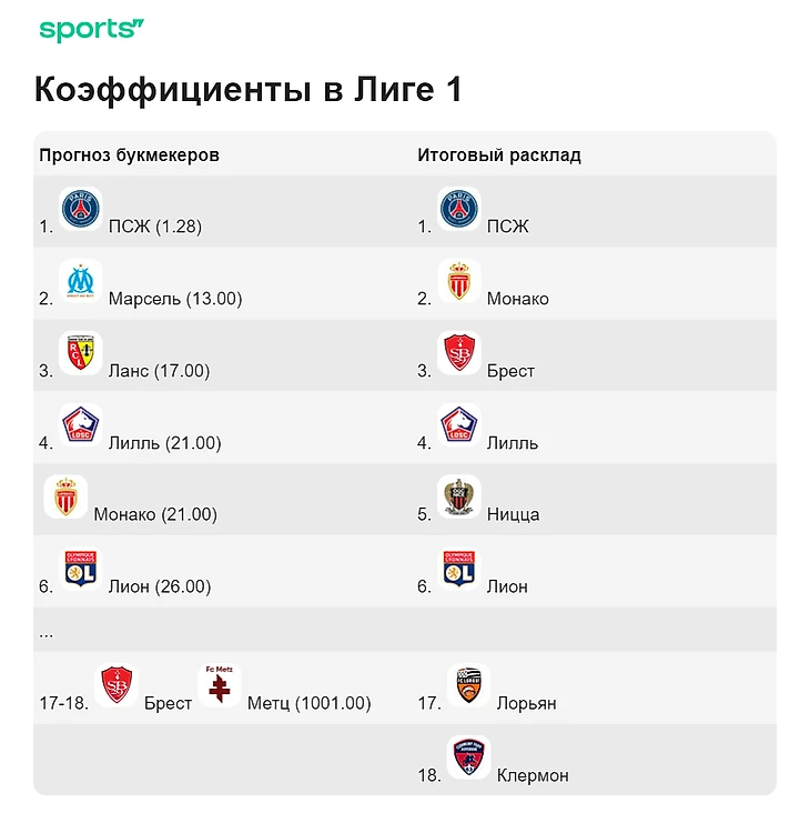 «Марсель» считали главным преследователем «ПСЖ», но он даже не попал в еврокубки. «Ланс», «Лилль» и «Монако» – в топ-6, в последний момент туда зашел и «Лион». «Ницца» оценивалась восьмой, но расположилась выше.