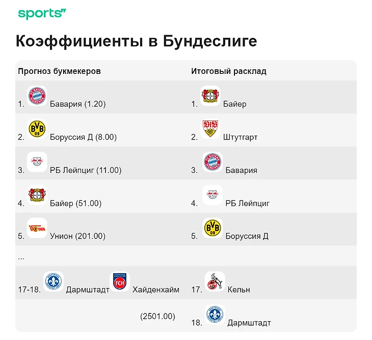 Конечно, «Бавария» котировалась явным фаворитом, а «Байер» просто пролезал в четверку. «Штутгарт» вообще оценивался как один из претендентов на стыковые матчи с коэффициентом 1001.00 на чемпионство, а закончил только позади «Байера». «Унион» ждали в пятерке, а он еле избежал вылета в последнем туре.