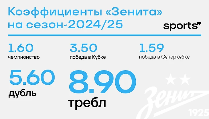 ● А если собрать экспресс из всех турниров, в котором «Зенит» не выиграет ни одного трофея? Напомним, 2.34 в РПЛ, 1.26 в Кубке и 2.46 в Суперкубке. Тогда выйдет 7.25.