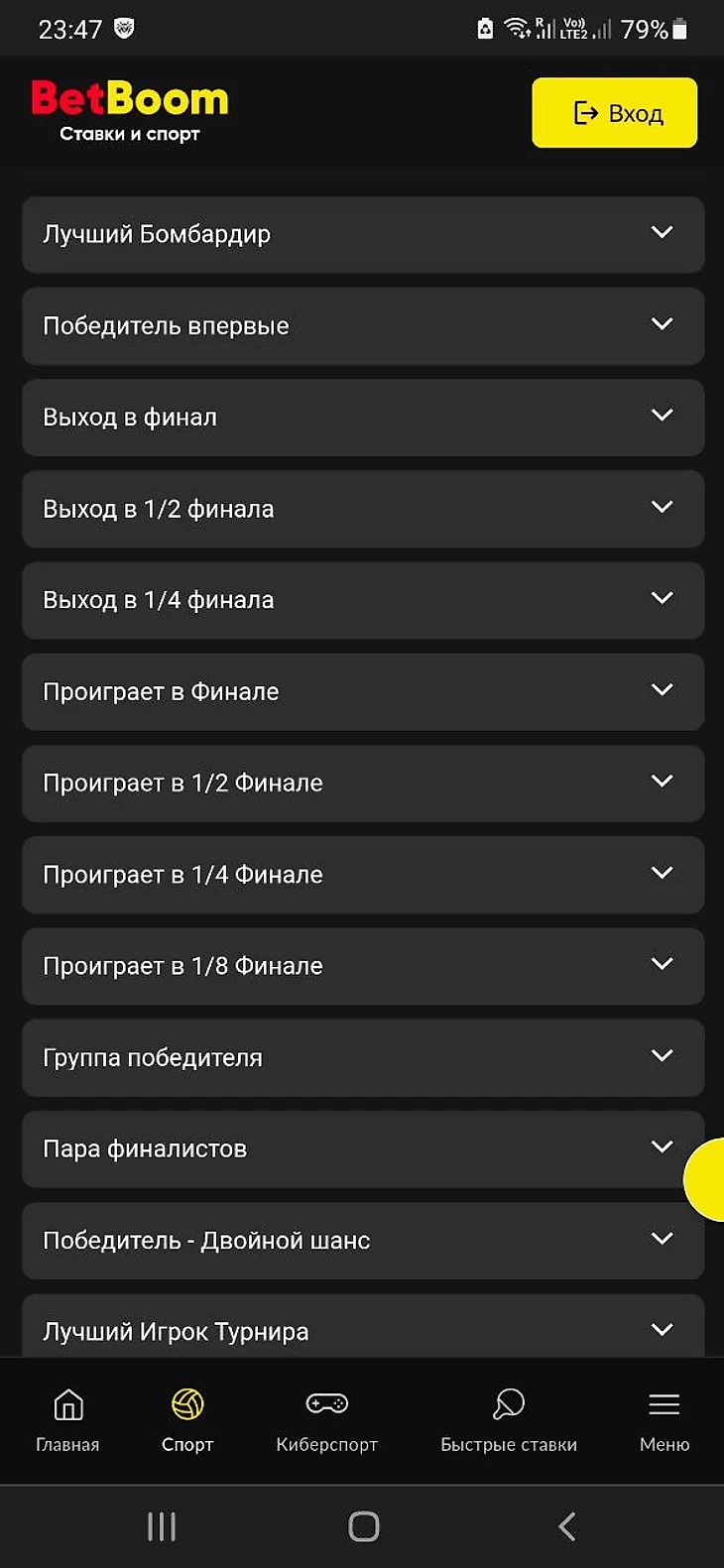 Букмекерская компания «Бетбум» за несколько недель до старта ЧЕ предлагает ставки на все матчи группового этапа и несколько десятков долгосрочных рынков с более чем 400 вариантами. Выбор аутрайтов максимально разнообразен – от ставок на чемпиона (или сразу 2 команды) и победителей групп до лучшего молодого игрока и проигрыша команды на стадии 1/8 финала (ни раньше, ни позже).