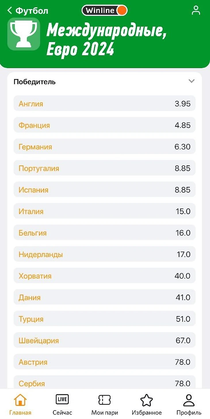 Winline оригинально подошел к распределению событий для ставок на своих платформах. На сайте букмекер предлагает заключать пари на 2 первых тура Евро-2024 без дополнительных вариантов – нет даже аутрайтов на победителя. В приложении бетторы найдут большое количество долгосрочных пари: