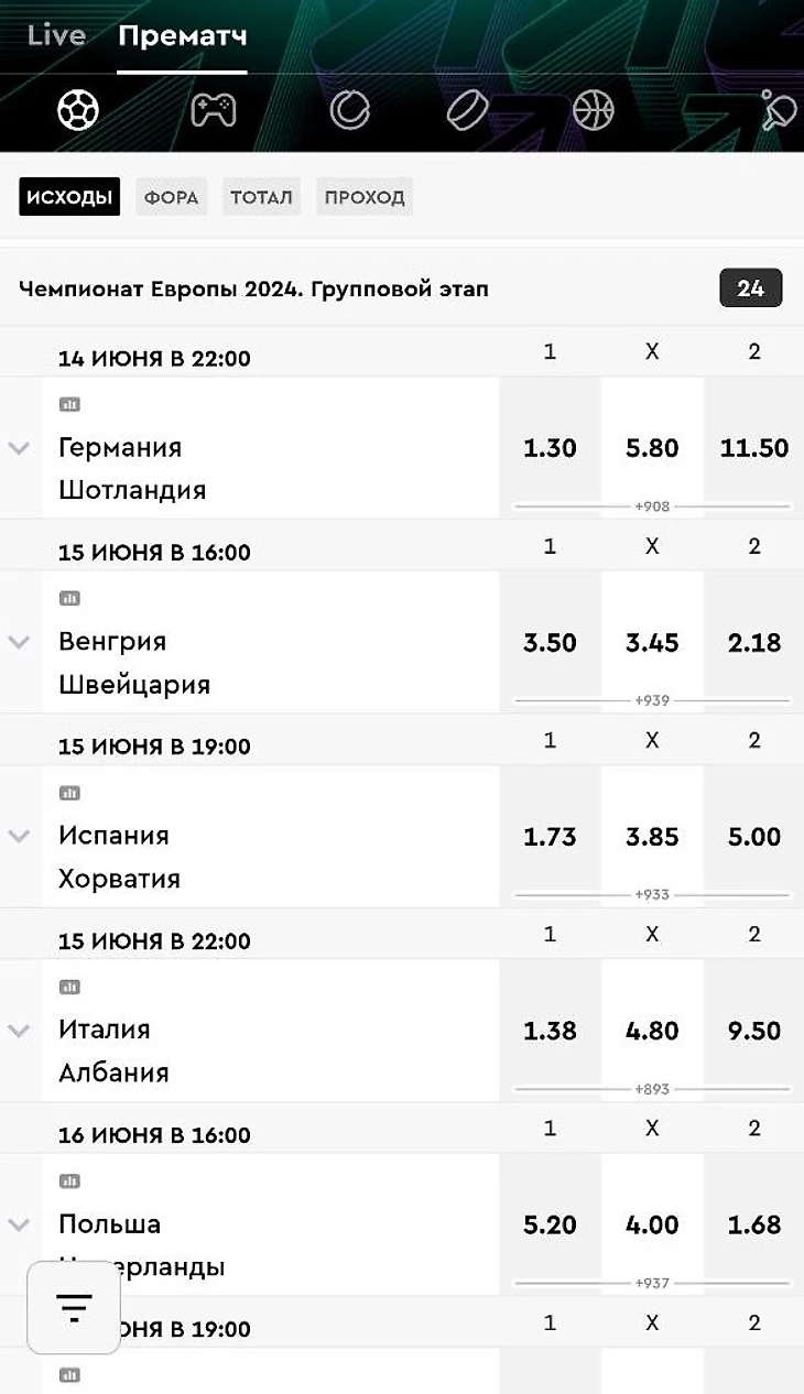 Линия букмекера Pari полностью повторяет линию Fonbet. Неизвестно, какова доля случайности в этом совпадении, но выбор событий и коэффициенты на Евро-2024 в этих БК идентичны.