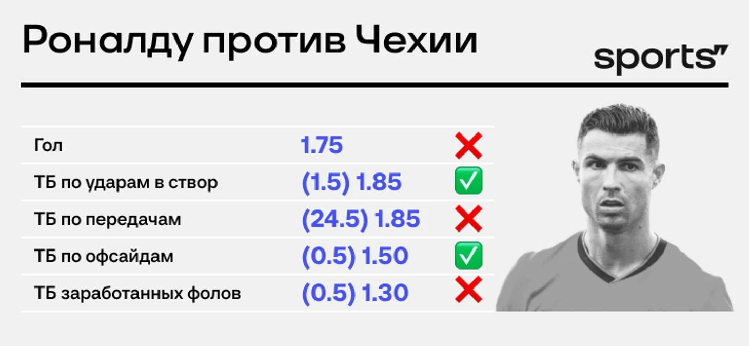 Букмекеры идеально попали в тотал передач. До игры ему давали 24.5. Криштиану не справился с задачей, сделав только 22 передачи в матче с Чехией. На тотал меньше по пасам было 1.85.