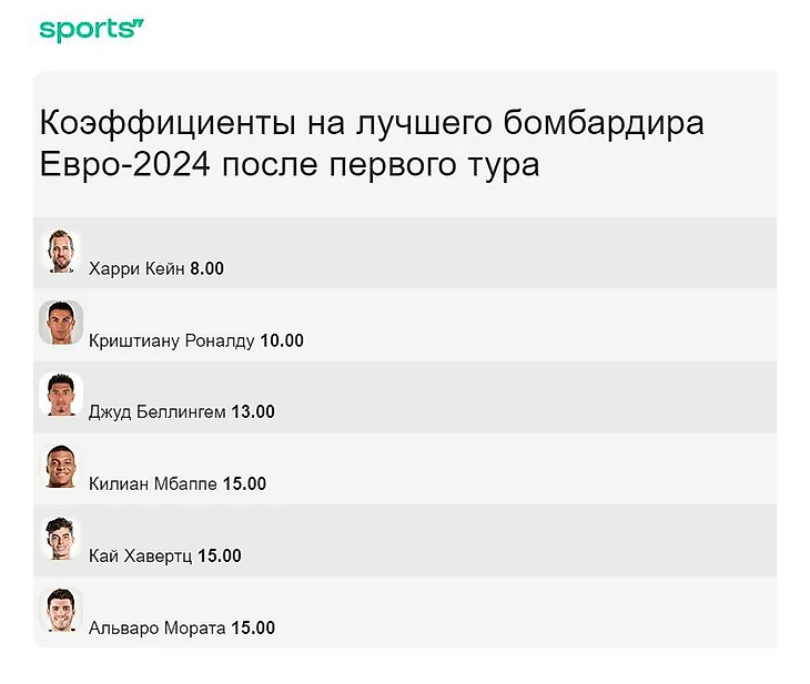 До матча коэффициенты на один гол Криштиану понизились до 1.75. Это один из минимальных показателей на нынешнем Евро. Схожие цифры были только у Килиана Мбаппе и Харри Кейна. У немцев Фюллькруга оценивают чуть выше, так как Никлас – не игрок стартового состава.