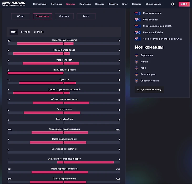 Статистика со следующими данными: Количество голевых моментов, удары в створ ворот, удары от ворот, промахи, угловые и многое другое.