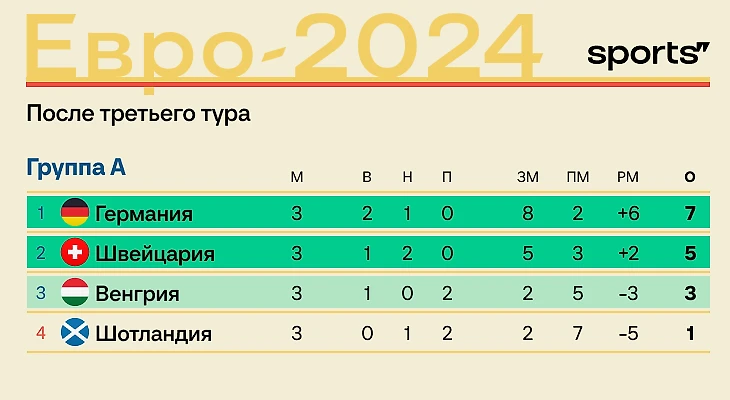 В группе А закончился групповой этап. Два матча третьего тура прошли в одно время – Германия принимала Швейцарию во Франкфурте, Шотландия и Венгрия играли в Штутгарте.