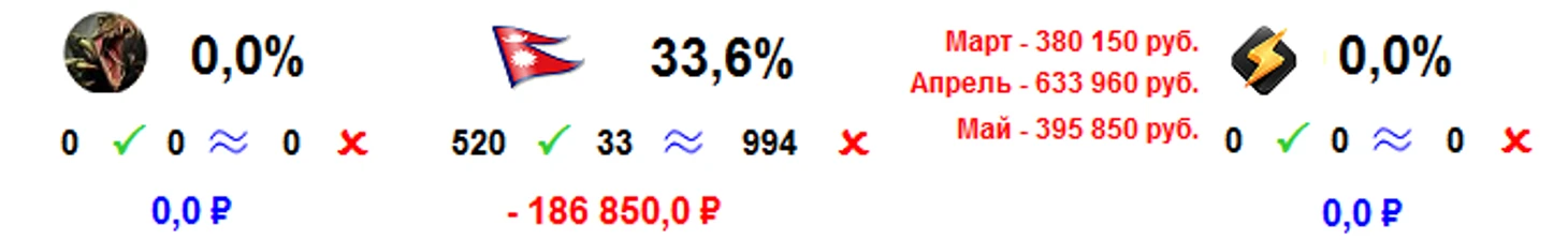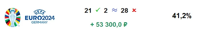 Последняя ставка лишней конечно была. Одним не надо ничего, других ничья устраивает.Ещё и уснул на середине)). Хотя там и страховать-то не дали. В целом, похоже мы ещё продвинулись к нулевой отметке, ну, а стату Евро подпортила эта ставка. Сейчас посчитаемся.