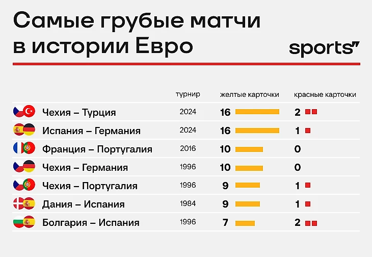 После сегодняшней битвы два самых грубых матча в истории – с Евро-2024. А до этого вообще долгое время была тишь да гладь в контексте схожих игр. В XXI веке только раз сборные добирались до десяти желтых карточек – в финале Евро-2016, когда Португалия обыграла Францию в дополнительное время.