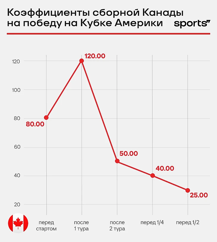 После первого тура коэффициент на венесуэльцев упал. А на Канаду, напротив, взметнулся до 120.00 – она уступила Аргентина 0:2. Затем состоялась важная победа над Перу, а в решающей игре за выход из группы против Чили Канада больше 60 минут провела в большинстве и сохранила нужные 0:0.