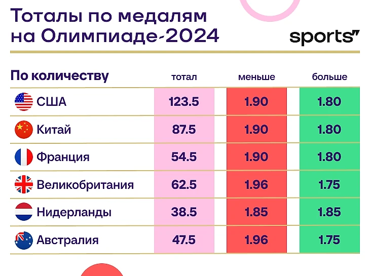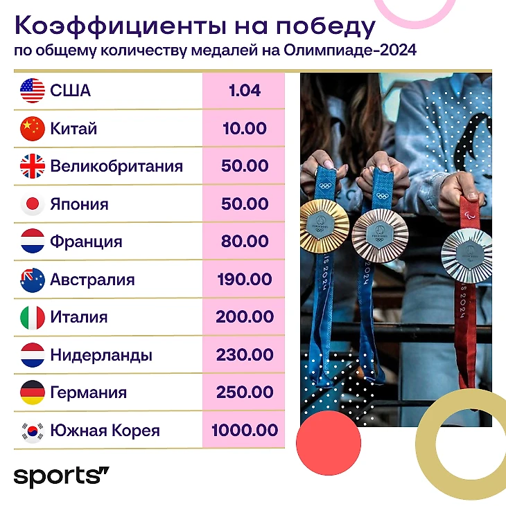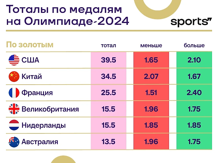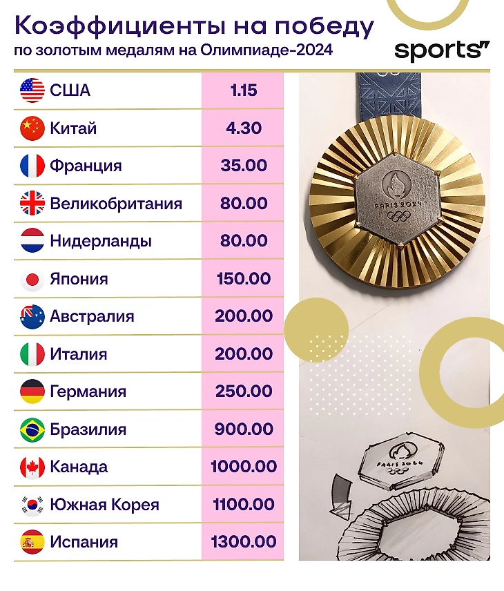 Вот какие котировки у букмекеров по стране-победителю медального зачета Олимпиады. Тут лидер, напомним, традиционно тот, у кого больше золотых.