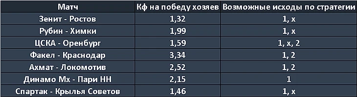Я не буду расписывать в чем суть стратегии, но мы будем в 3 туре искать матчи, которые могут завершиться на ставку П1. Почему П1? Потому что это самый предсказуемый исход в матчах в РПЛ и самый стабильный исход по частоте его наступления.