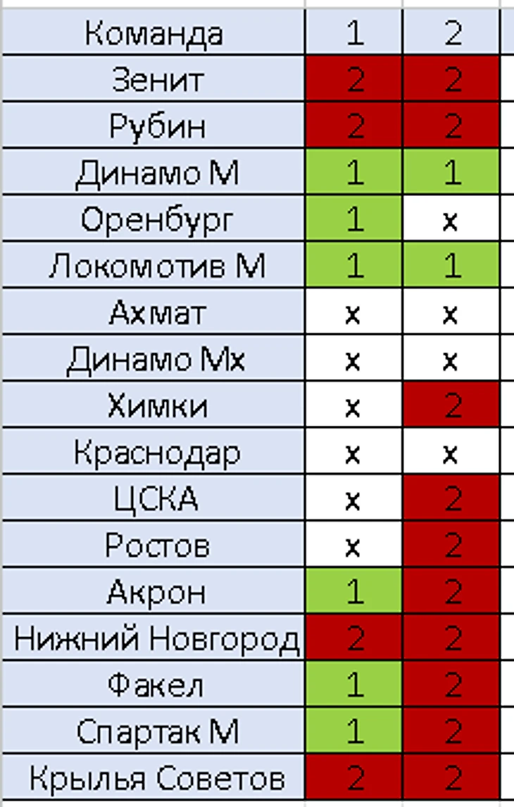 В своей стратегии, я описывал не просто победы/поражения команд, а именно исход матча у команды. И после 2 туров РПЛ, мы видим следующую картину(смотрим таблицу ниже), что Зенит, Рубин, Ахмат, Динамо Мх, Краснодар, ЦСКА, Ростов, Пари НН и Крылья Советов еще ни разу не сыграли свои матчи на исход П1. Как видно из таблицы выше, каждый 2,28 матч в РПЛ у каждой команды играется на ставку П1. сейчас сыграно 2 тура и можно попробовать эти матчи начать искать. Легко было бы после 3 тура, когда количество матчей уже сыграно выше среднего, но не факт что эти матчи могут остаться после 3 тура.