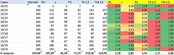 Тем более, если посмотреть историю сезонов и как сейчас обстоят дела с П1, то тут есть явный перекос и недобор этого исхода. Как видим из таблицы ниже, П1 в новом сезоне играется в среднем через 4 матча, против 2,28 по всей истории чемпионатов РПЛ. Таким образом надо попробовать вычленить матчи, которые могут завершиться победой хозяев в 3 туре.
