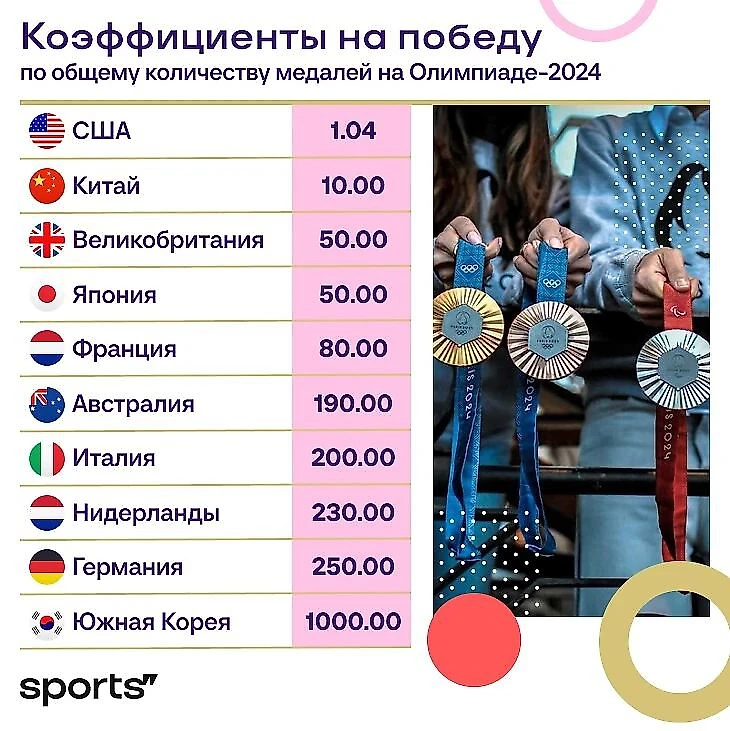 По общему количеству медалей победа США была даже несколько недооценена за 1.04. Тут как будто бы американцы могли проиграть, только если бы половина сборной не доехала до Парижа: 126 медалей против 91 у Китая и 65 у Великобритании. Это другая планета.