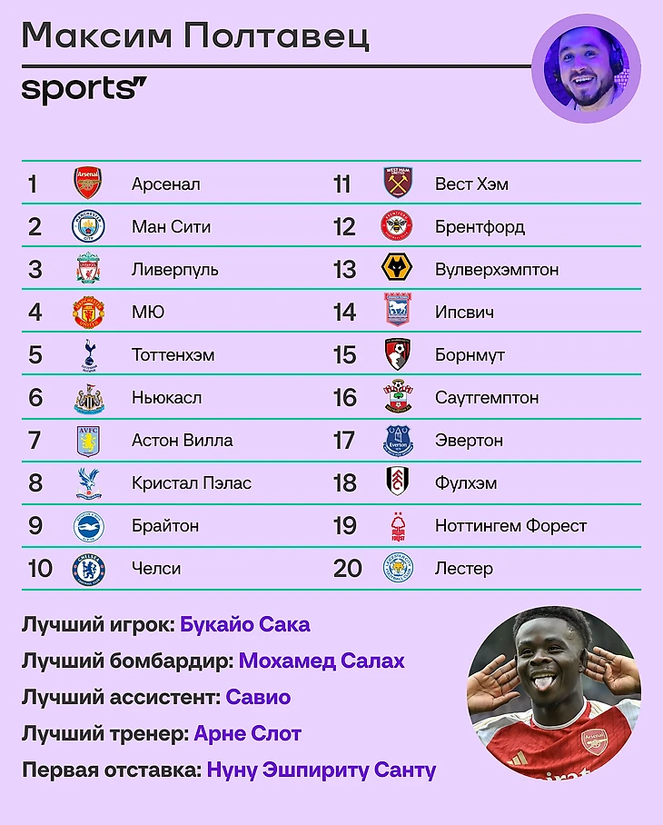 Лучший игрок: Букайо Сака («Арсенал»). На фоне искренней веры в то, что «Арсенал» в этом сезоне все-таки доберется до чемпионства, логично выбрать и лучшего игрока из состава этой команды. Хочется проголосовать за Салиба, но при прочих равных МВП выберут атакующего англичанина, а не французского защитника. Хотя защита «Арсенала» даже в прошлом сезоне выглядела монументально.