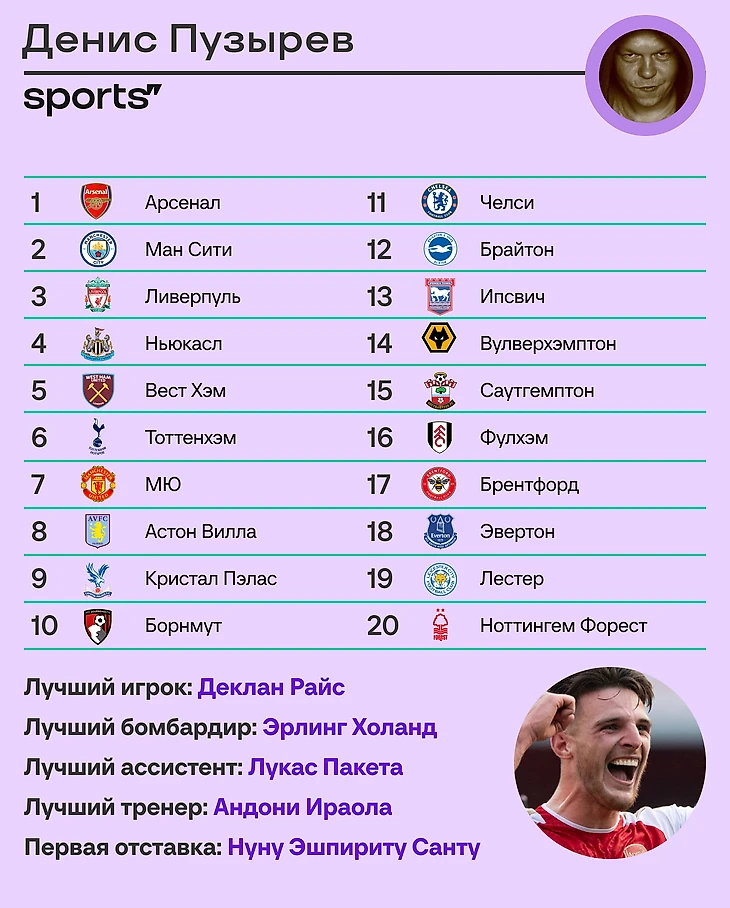 Лучший тренер: Микель Артета («Арсенал»). В истории АПЛ всего пять раз лучшим тренером называли менеджера, не выигравшего чемпионат. Пусть будет шестой: испанец точно заслужил.