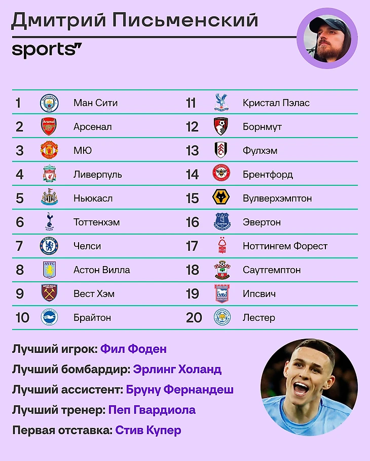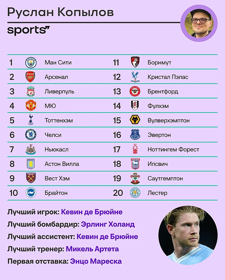 • Снова жду гонку «Сити» и «Арсенала». Артета каждый год сокращает отрыв, но решающим фактором выберу ласт дэнс, который могут устроить Гвардиола и КДБ. Допускаю, что поборется «Ливерпуль», но пока они слишком хороши, чтобы не попасть в ЛЧ, но недостаточно, чтобы выиграть титул. Вероятно, станут третьими – с приличным отрывом от четвертого места и таким же приличным отставанием от первых двух.