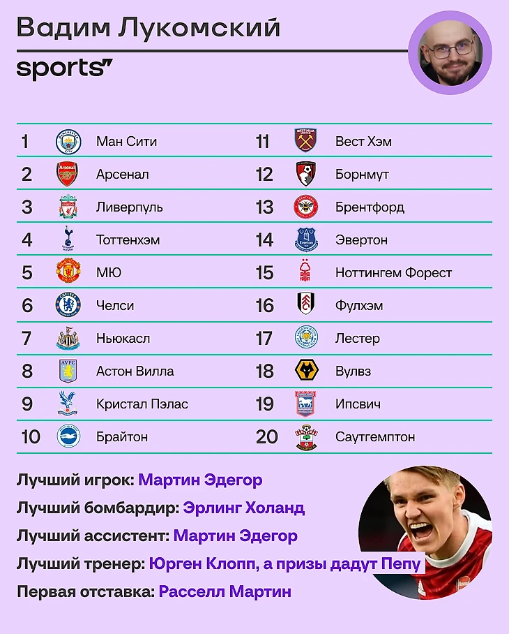 Лучший игрок: Мартин Эдегор («Арсенал»). Просто GOAT. У тех, кто вручает награды, есть шанс это наконец признать.