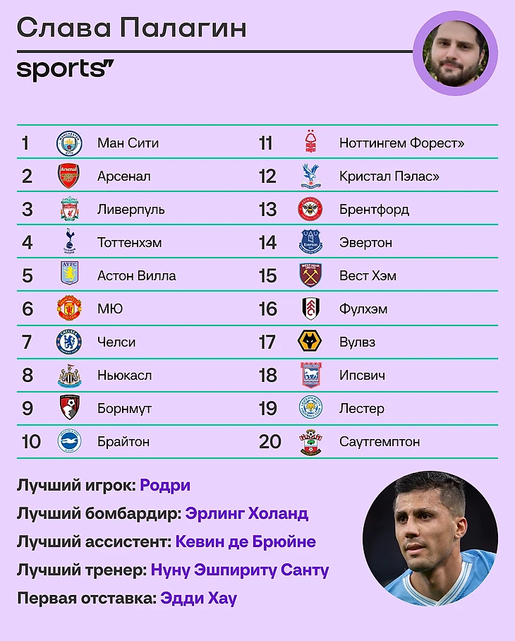 Лучший тренер: Нуну Эшпириту Санту («Ноттингем Форест»). Обычно признают тренера-победителя. Поэтому скорее всего либо Пеп, либо Артета. По-моему, слишком скучно, так что поменяю ТЗ и выберу тренера, который сильнее всего превзойдет достижение прошлого сезона. Мой фаворит – Нуну. Португалец спас «Ноттингем Форест» только за тур до конца, но команда уже построена по его образцу. Отражение – восьмое место по ожидаемым очкам после прихода португальца: выше «Астон Виллы» и «МЮ» и почти наравне с «Тоттенхэмом». Можно ожидать скачка и с учетом этих вводных, и с учетом предсезонки (к прошлому сезону команду готовил Стив Купер).