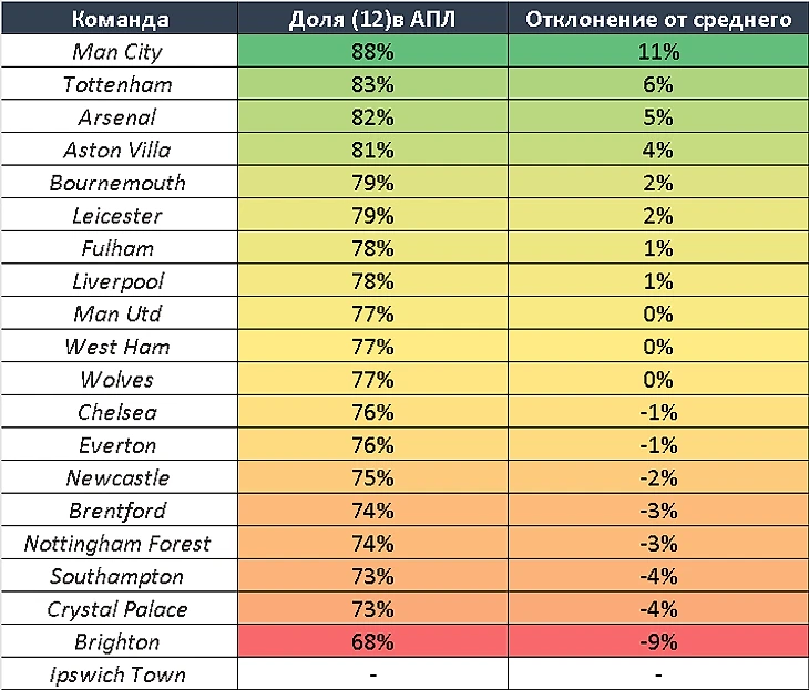 Как видим из таблицы, доля ставки (12) выше среднего в АПЛ ярко выражена у Ман Сити, Тоттенхэма и Арсенала. А вот Ливерпуль, о котором я думал будет лидером, всего лишь на 1% чаще играет на ставку (12) от средних показателей АПЛ.