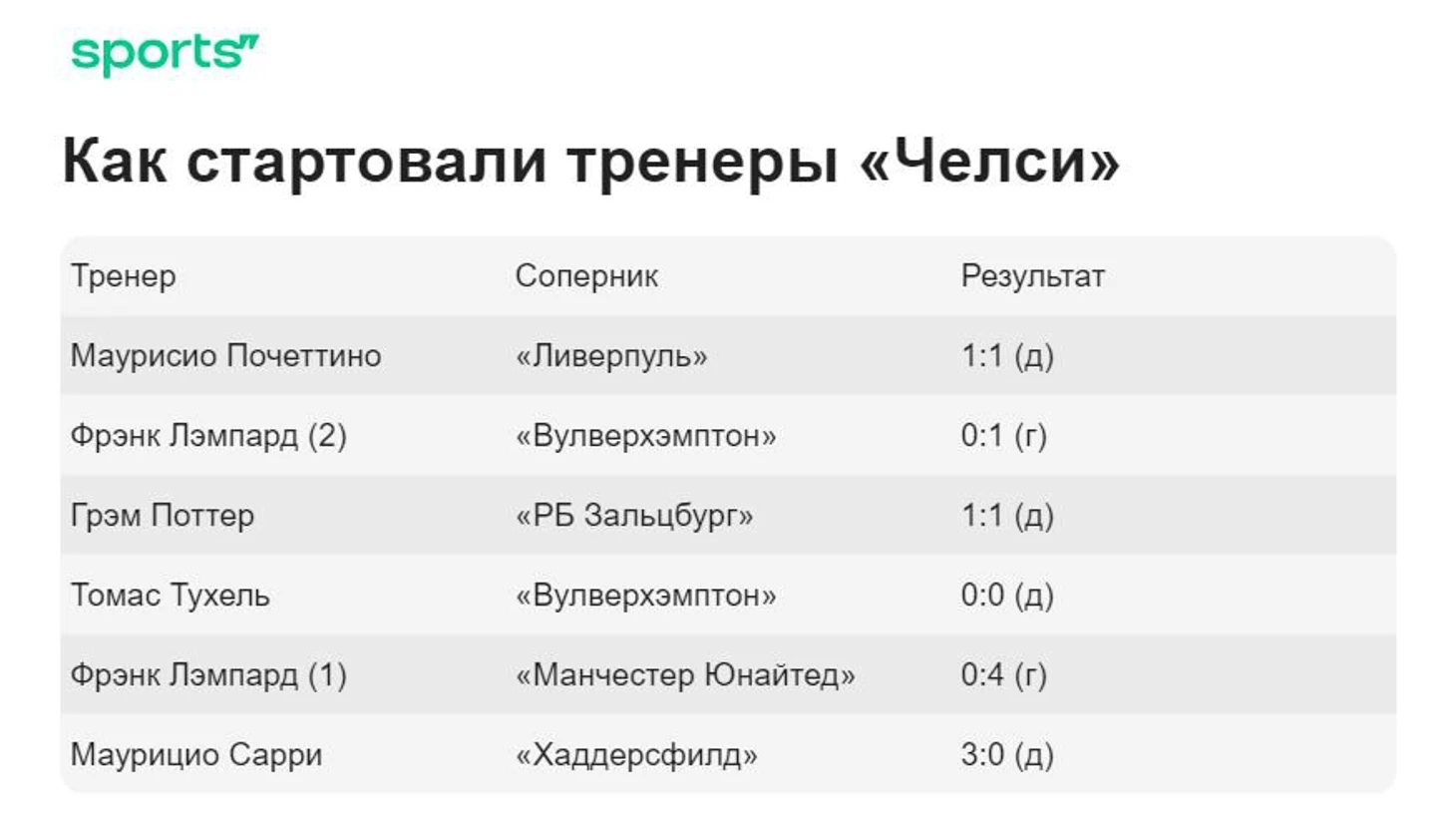 Фрэнк Лэмпард в позапрошлом сезоне так вовсе выдал антирекорд из четырех поражений; Маурисио Почеттино открыл отрезок карьеры, поделив очки с «Ливерпулем»; Грэм Поттер дебютировал с ничьей против «Зальцбурга»; Томас Тухель не смог победить «Вулверхэмптон», первый заход Фрэнка Лэмпарда стартовал с разгрома от «Манчестер Юнайтед».