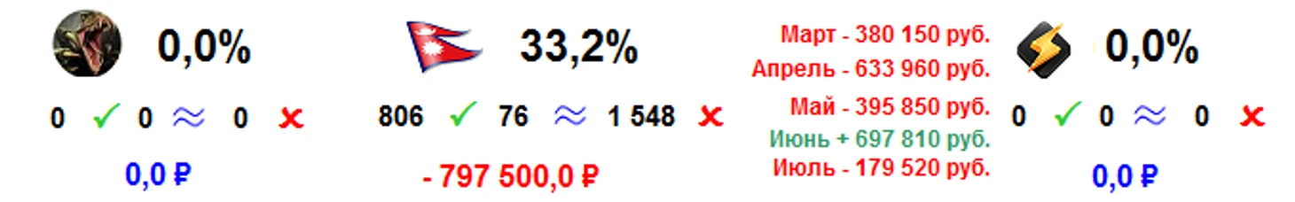 После подвигов НН в Самаре, 6-ти голов никакущего Челси и ставки на предкубковый матч в Дании стало ясно , что если продолжить, то .... ))) А так отделались 150к за уикэнд.