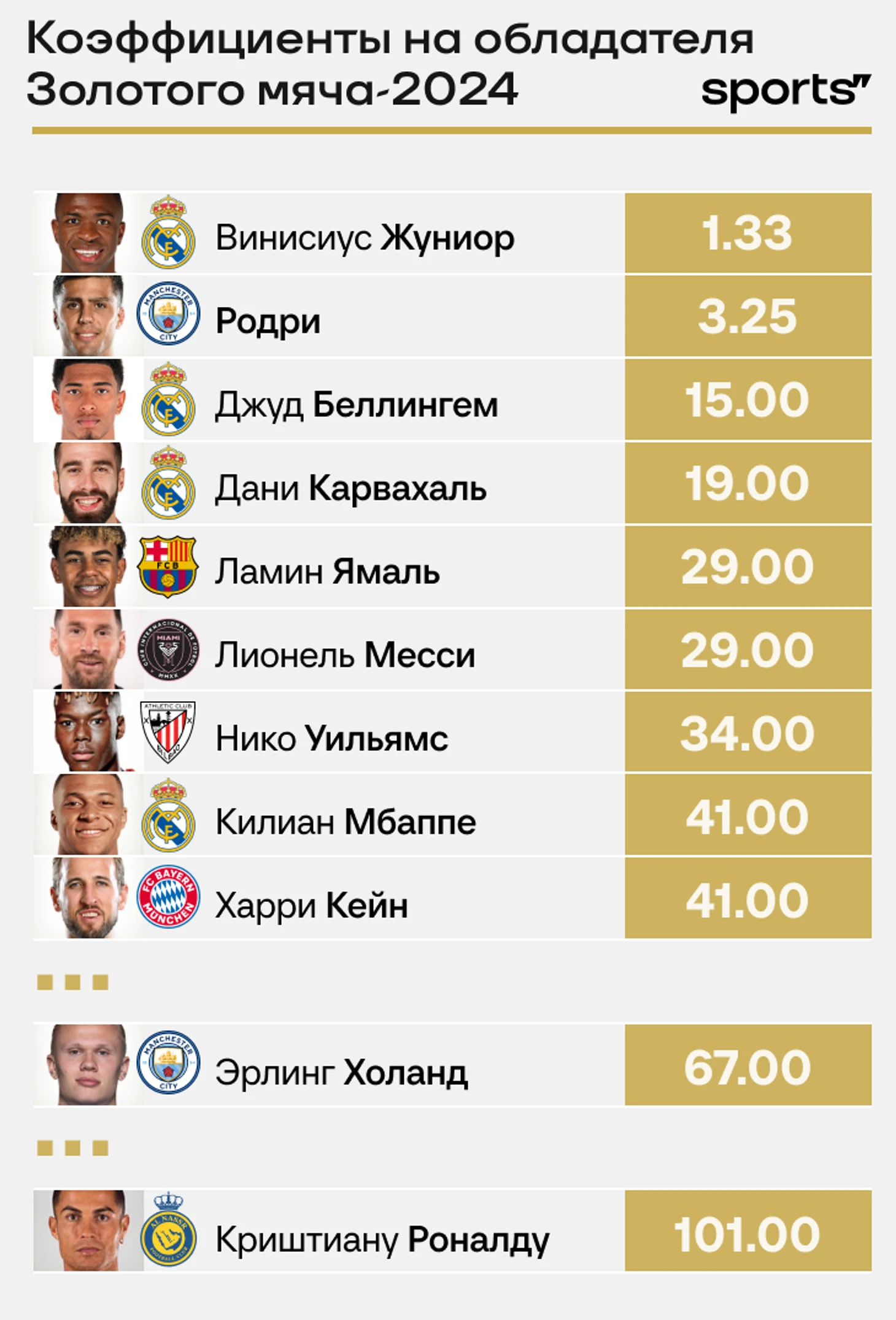 Еще месяц назад разрыв был совсем не таким ощутимым: 2.00 давали на Винисиуса, 2.50 – на Родри, 7.10 – на Беллингема. Букмекеры включили и Роналду, но в переводе на процент вероятности его шансы не превышают 1%.