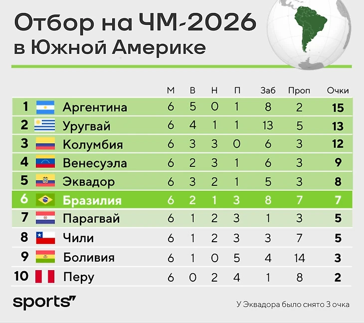 Бразильцы – прямо на границе с зоной стыков, в ней пока Парагвай. Отставание от Эквадора было бы и больше, если б не история с тремя снятыми очками из-за выступления за эту сборную колумбийца Байрона Кастильо.