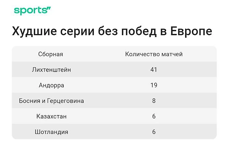 Лихтенштейн прямо сейчас – худшая сборная Европы: 41 матч без побед во всех турнирах, проиграли Сан-Марино и занимают последнее место в группе. Единственная сборная с сопоставимой статистикой – Андорра (19 матчей без побед).