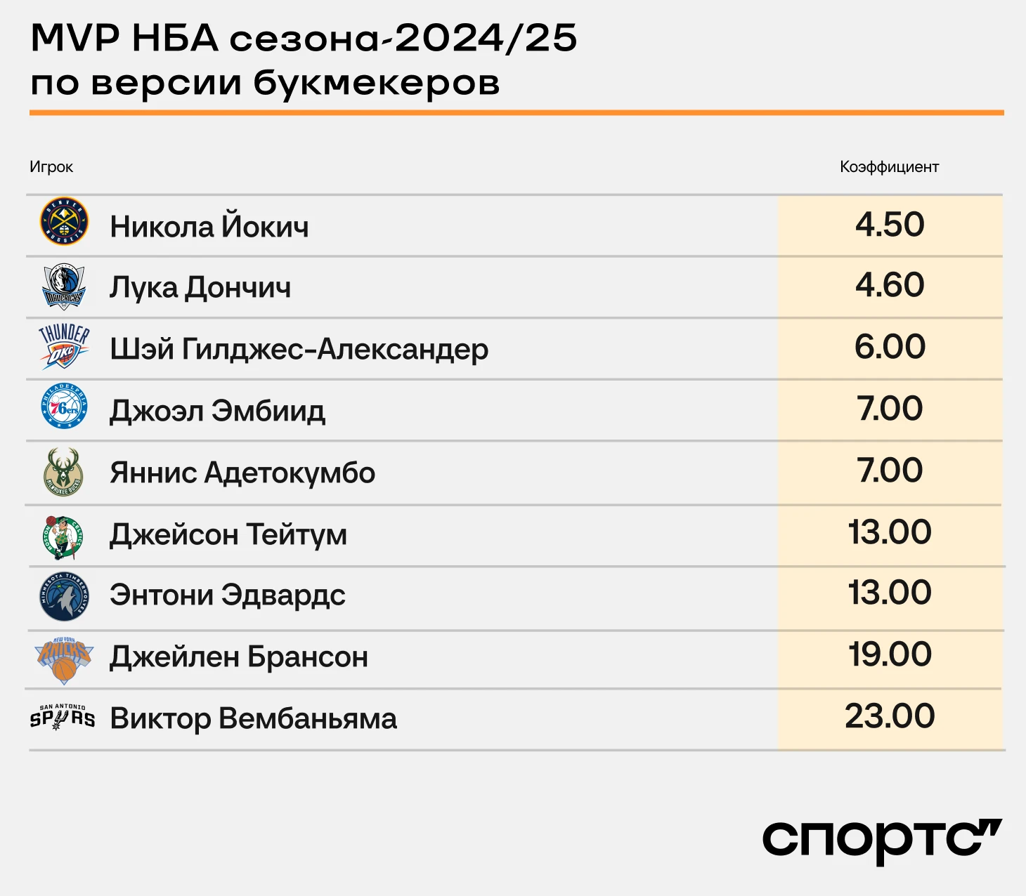 Здесь гораздо плотнее, чем в раскладах на чемпионство. Главными претендентами на звание MVP в БЕТСИТИ считаются Никола Йокич и Лука Дончич. А Джоэл Эмбиид котируется четвертым фаворитом.