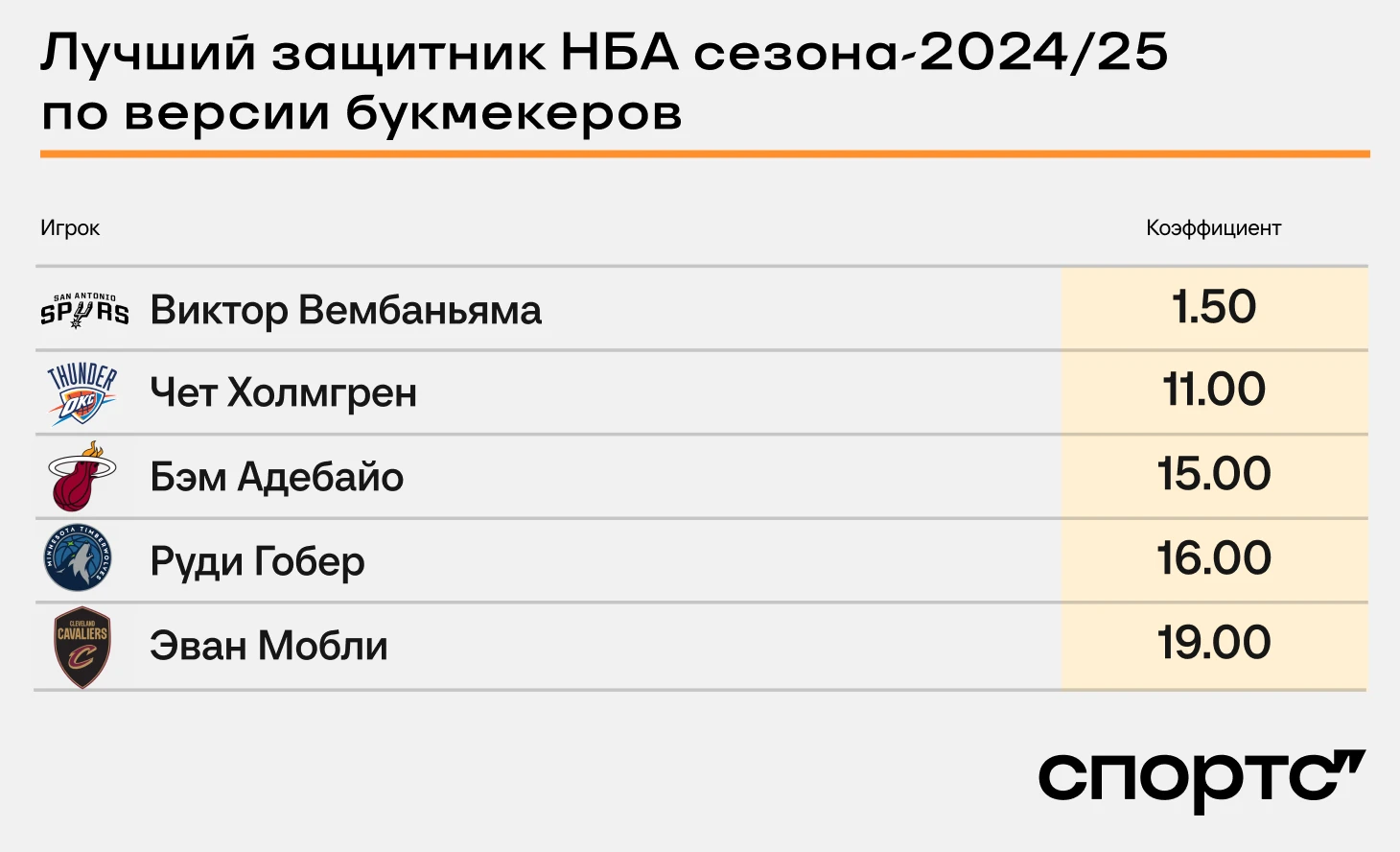 Одна из самых прозрачных линий – на лучшего защитника лиги. Виктор Вембаньяма – первый фаворит на эту награду. Главным конкурентом аналитики видят Чета Холмгрена, но он о-о-очень далеко.