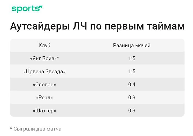 Если брать первые таймы в Лиге чемпионов, то показатели хуже только у «Янг Бойз», «Црвены Звезды» и «Слована». Естественно, что 8:1 во вторых таймах – первое место.