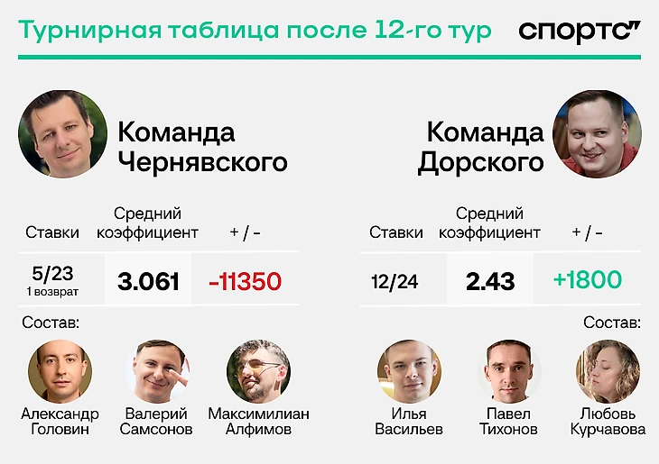 Соперничают две команды главных экспертов по российскому футболу: четверка Глеба Чернявского (Александр Головин, Валерий Самсонов, Максимилиан Алфимов) и дримтим Александра Дорского (Илья Васильев, Павел Тихонов и Любовь Курчавова).