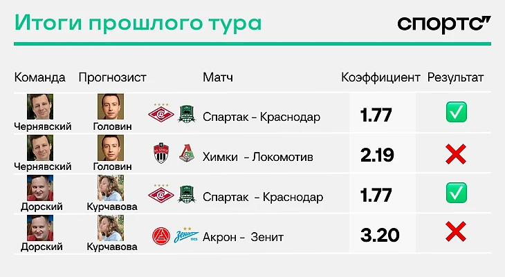 В прошлом туре было два точных одинаковых прогноза от Любови Курчавовой и Александра Головина: угадали, что в матче «Спартака» и «Краснодара» будет нескучно.