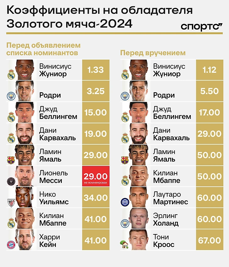 Любопытно, что при открытии линии на обладателя «Золотого мяча»-2024 Винисиус был только седьмым претендентом с кэфом 21.00. Главным фаворитом котировался Беллингем (4.00).