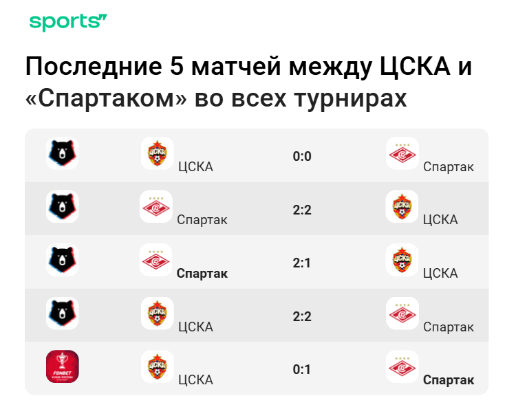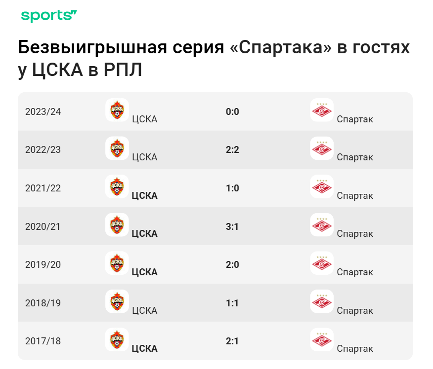 ЦСКА же в последний раз обыгрывал «Спартак» в 2022-м – помогли голы Юсуфа Языджи и Бахтиера Зайнутдинова. Получается любопытная тенденция: «Спартак» не побеждает ЦСКА в гостях 7 лет в РПЛ, но не проигрывает в 5 последних матчах во всех турнирах.