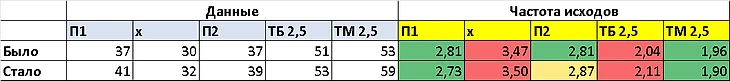 Как видим, исход П1 до 14 тура был на уровне частоты 2,81, сейчас стал 2,73. А в среднем по сезону должно быть на уровне 2,28. Т.е. и дальше будет тренд на П1, который нужно ловить!