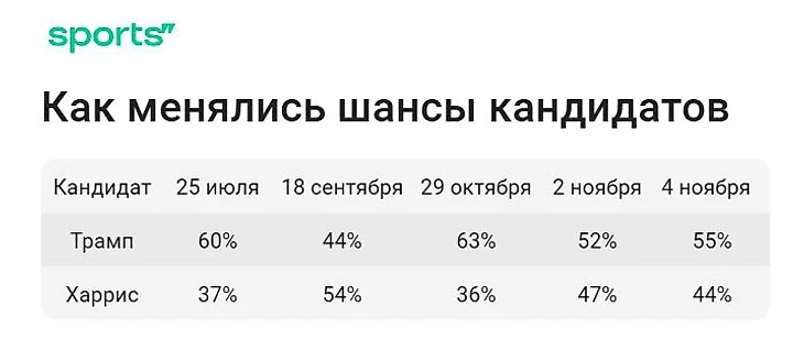 По ходу гонки позиции политиков сильно менялись. Максимальная вероятность на победу у Трампа пересекала отметку в 68%. Это случилось в январе 2024 года на фоне крупного успеха политика на выборах кандидата в президенты от Республиканской партии. Низшая точка падения – 44%. Так успех Трампа оценивали в середине сентября 2024 года.