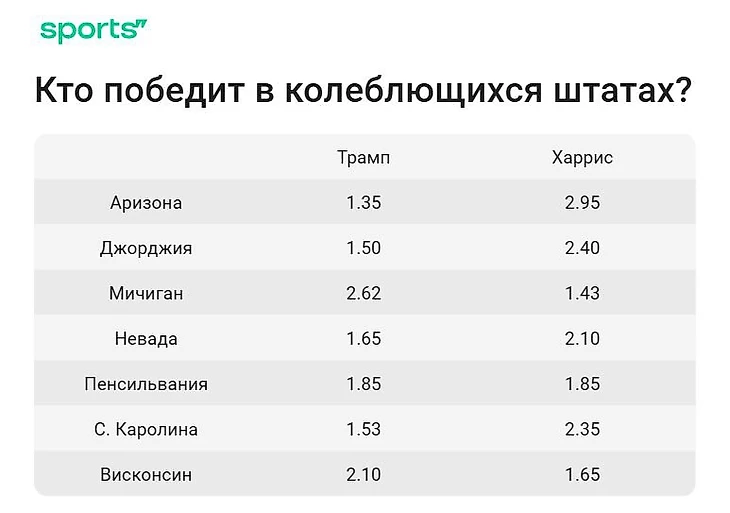 У зарубежных букмекеров в 2024 году есть отдельные линии на каждый штат. Аналитики смогли выделить явных фаворитов даже в колеблющихся регионах. Единственное исключение – Пенсильвания. Здесь в буквальном смысле подброс монетки – 50 на 50.