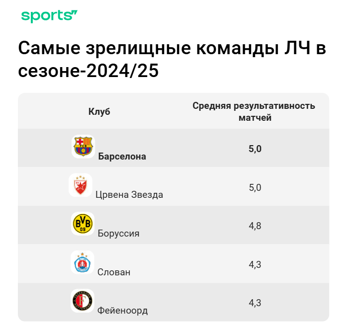 5 голов в среднем за игру в ЛЧ. Сине-гранатовые делят первое место с «Црвеной Звездой», которую вынесли в последнем туре. Правда, высокая результативность в матчах с участием сербов (и других аутсайдеров в этом списке) – заслуга их соперников. «Барселона» же устраивает шоу собственноручно.