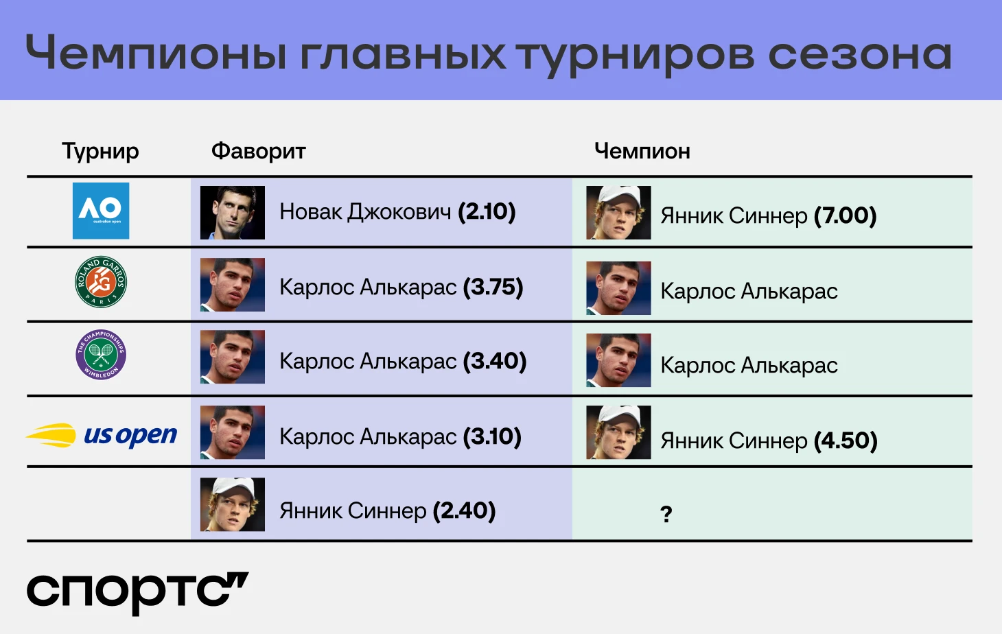 Победа испанца на «Уимблдоне» – не сенсация: коэффициент был даже ниже, чем в Париже (3.40), хотя Карлоса и ставили вторым после Синнера. Джокович был третьим и чуть превзошел прогноз аналитиков, выйдя в финал.