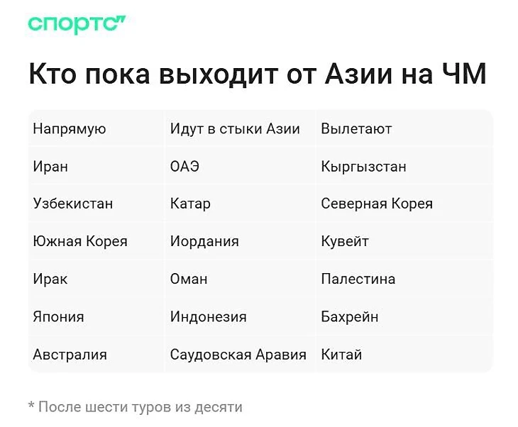 В Азии уже весной определятся первые участники чемпионата мира. Тройка фаворитов не без приключений, но с угрозами справляется: Иран, Южная Корея и Япония – почти выполнили задачу. При этом корейцы во главе с Соном умудрились не обыграть в шестом туре Палестину.