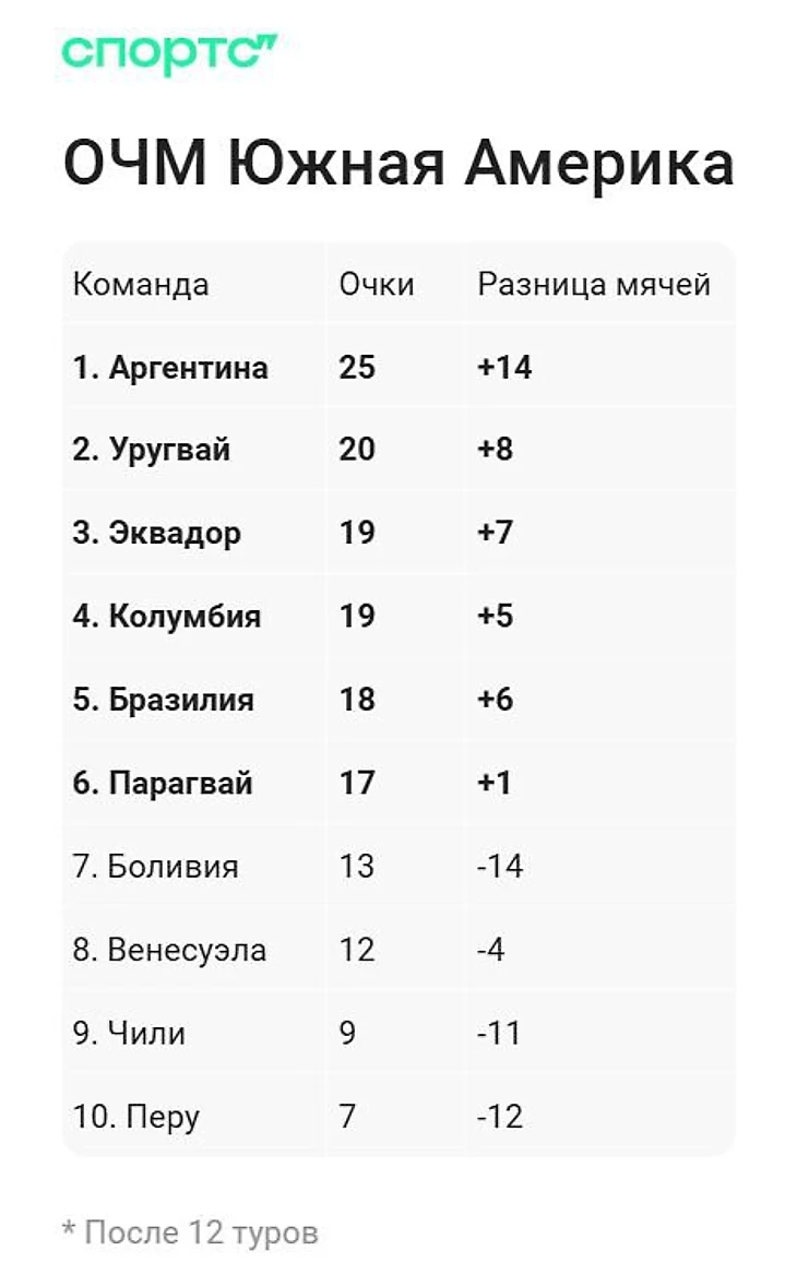 В Южной Америке после расширения – самый щадящий отбор среди всех зон. В турнире из десяти команд нужно занять место в шестерке, чтобы завоевать прямую путевку, а седьмая позиция отправит в стыковые встречи.